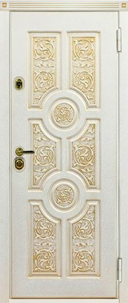 Уличная входная дверь Версаче о Сталлер декорирована изящными объемными фрезеровками в стиле ампир и золотой патиной. Помимо эстетичного внешнего вида эта модель обладает рядом свойств для защиты вашего дома: теплоизоляция, шумоизоляция, устойчивость к возникновению конденсата, воздействию солнечных лучей, температурных перепадов. Показатели по шумоизоляции составляют от 41 дБ. Изготовление конструкции по гибочно-профильной технологии обеспечивает надежность при эксплуатации и высокий срок службы.
